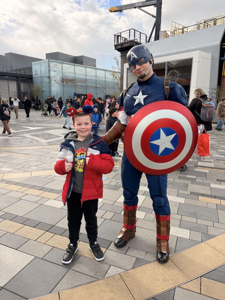 Shortly after he had his first superhero encounter booked and was excited to see it was Captain America / Falcon. After the encounter you can walk around some incredibly well designed photo areas where they can pretend to be superheroes.